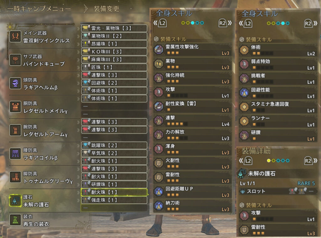 クリア時の装備はこんな感じ。火耐性(火やられ対策)と回避距離(広範囲の攻撃が多いため)を入れて、後は手持ちの護石と相談しながら攻撃スキルを盛りました。