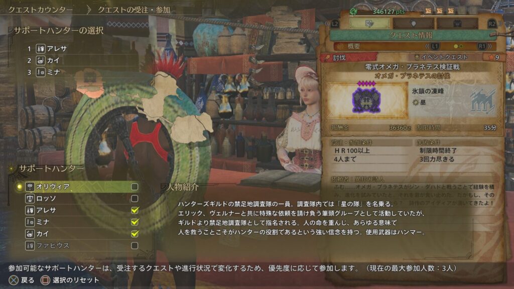 サポートハンターの選択でアレサ、ミナ、カイを選択