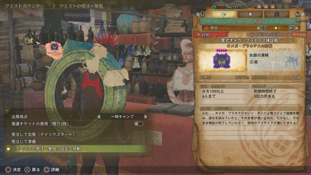 クエスト選択後、「クエストの受注、参加」設定へ移動