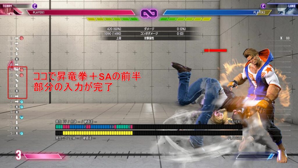 赤で囲った部分で、昇竜+SAの波動コマンド1回分の入力が完了