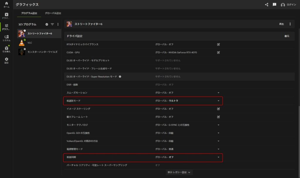 またPC版でNVIDIAのグラボを使用している場合は、NVIDIAのアプリを起動して「グラフィックス→プログラム設定」からスト6を選択し、下部にあるドライバ設定の低遅延モードをウルトラ、垂直同期をオフにします。