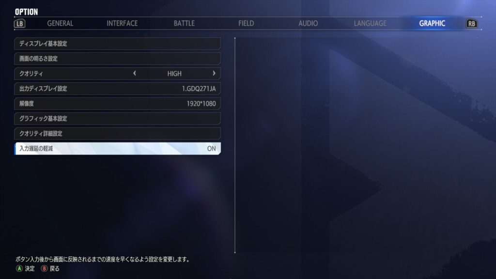 ゲーム内のマルチメニューから「OPTION→GRAPHIC」と遷移し、入力遅延の軽減の項目をONに。