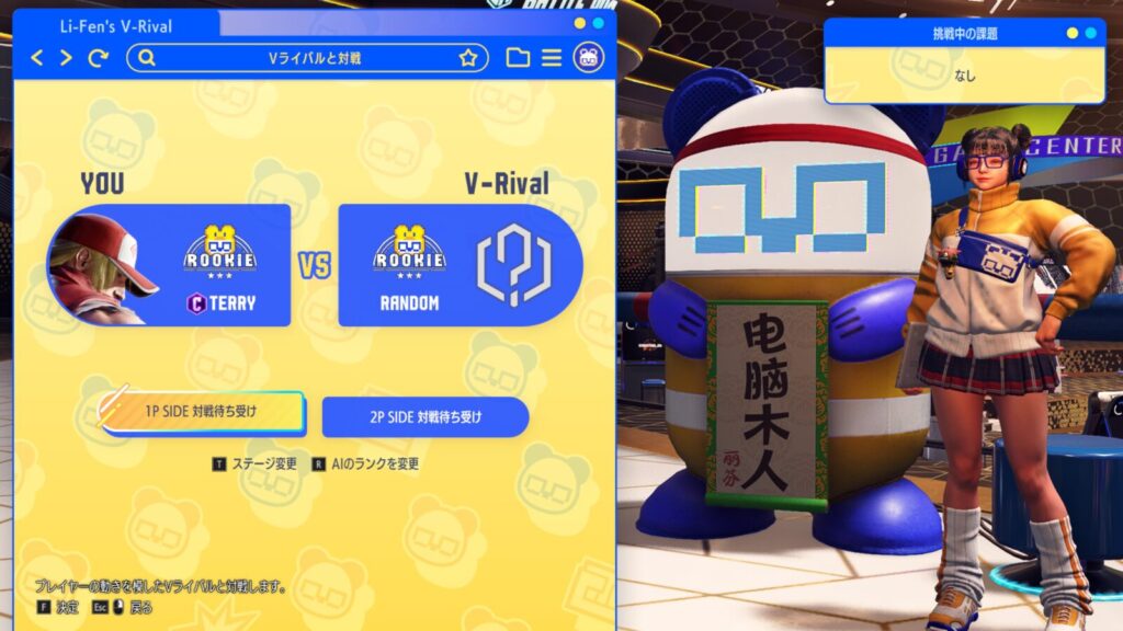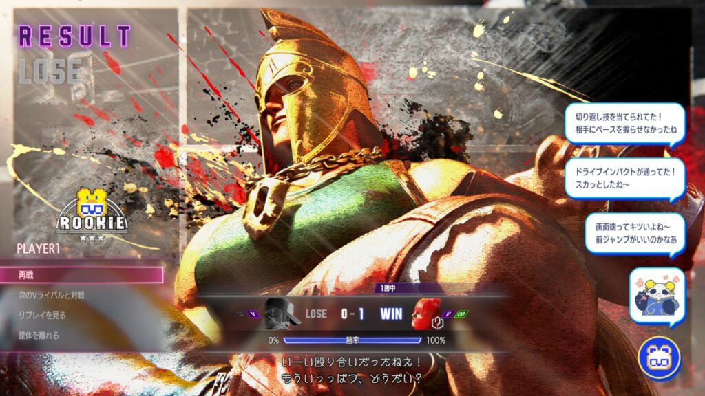 普通にバーサスやトレモで戦っても良いのですが、スト6には”Vライバルマッチ”というランクマのプレイヤーの動きを学習したAI「まねもんくん」と戦える神システムがあります。