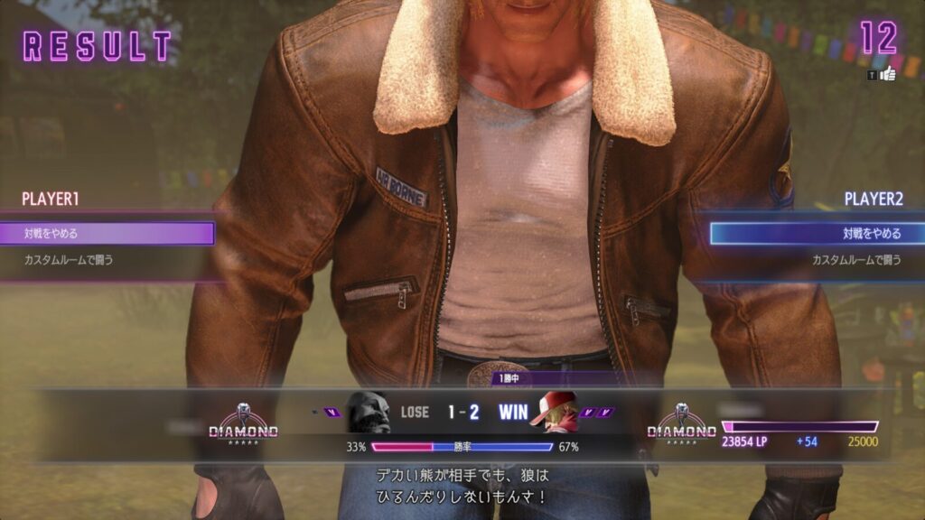 ダイヤ帯では、基本的なコンボや起き攻めは標準装備しているプレイヤーが増加。プラチナ帯よりミスも減ってきます。ただし、お互い立ち回りや防御面は詰め切れておらず、先に技を当てて攻め切った方が勝つ、といった大味な試合展開が多かったです。